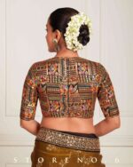 - Multicolor Thread And Sequins Embroidery Works On Black Georgette Blouse With Golden Beads And Tassel Detailing’s On front.