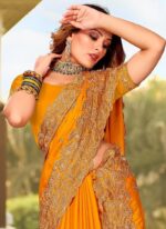 Mustard Satin Blend Embroidered Saree Party Wear