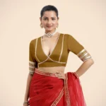 Home Blouse Half-Sleeve Blouse Nafeeza x Tyohaar | Bronze Gold Embellished Elbow Sleeves FlexiFi Saree Blouse with Plunging V Neckline with Tasteful Golden Gota Lace