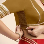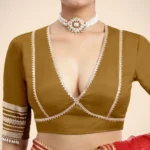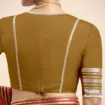 Nafeeza x Tyohaar | Bronze Gold Embellished Elbow Sleeves FlexiFi Saree Blouse with Plunging V Neckline with Tasteful Golden Gota Lace