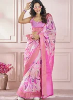 • The saree comes paired with a Pink Soft Silk Printed Zari Woven Blouse designed to complement the sarees elegance. The blouse can be customized to your preferred style whether its a classic round neck a bold Vneck or even a chic sleeveless design. This customization option allows you to tailor the outfit to suit your personality and the occasion.