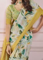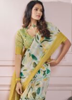 • The saree comes paired with a Mustard Soft Silk Printed Zari Woven Blouse designed to complement the sarees elegance. The blouse can be customized to your preferred style whether its a classic round neck a bold Vneck or even a chic sleeveless design. This customization option allows you to tailor the outfit to suit your personality and the occasion.
