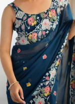 - Accompanying the saree is a Teal georgette embroidered sequins blouse which can be customized to suit your personal preferences. Whether you desire a more contemporary style with a deep Vneck or a more traditional cut with short or long sleeves the blouse can be tailored to create the perfect fit and design for your style. This level of customization allows for a truly unique and personal touch ensuring that the outfit not only looks but feels perfect when worn. The blouses sequins embroidery complements the saree maintaining a cohesive look while the customization offers versatility in terms of fit and design making the outfit adaptable for various body types and fashion preferences.